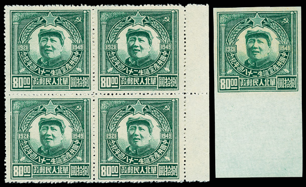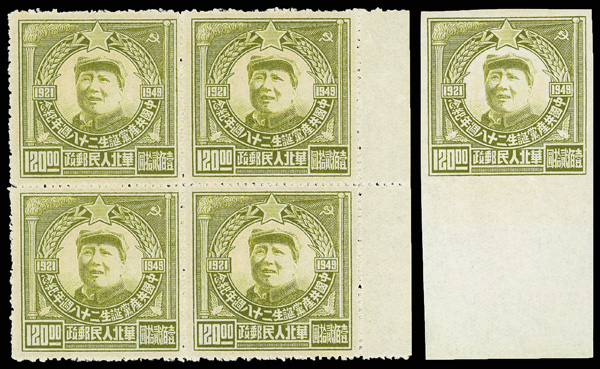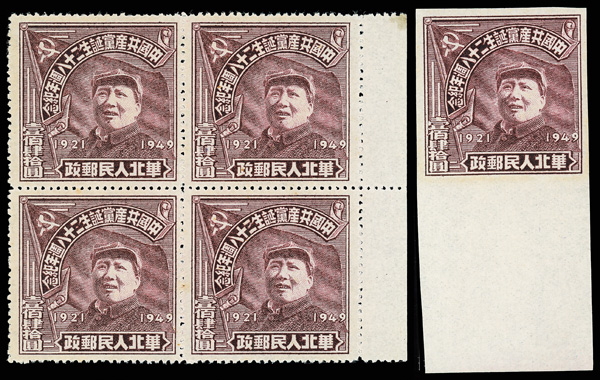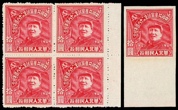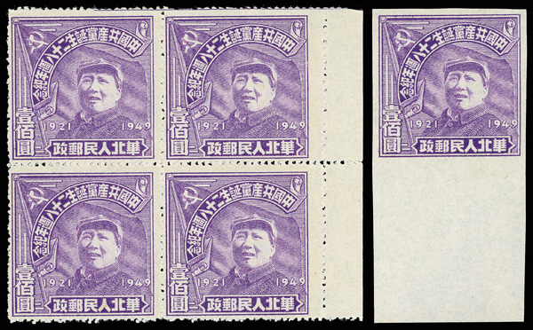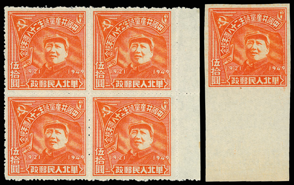 4341 ng image1949, Chinese Communist Party 28th Anniversary, perf. 14 & imperforate complete (Yang NC381-387 vars. Scott 3L82-3L88 vars.), a pristine group, comprising right margin perforated blocks of four, plus an imperforate set of bottom margin singles, without gum as issued, Very Fine and fresh. Scott $352 as singles (HK$ 2,710). (Image1) (Image2) (Image3) (Image4) (Image5) (Image6) (Image7) (Image8) (Image9) (Image10) (Image11) (Image12) (Image13) (Image14) (All Images)