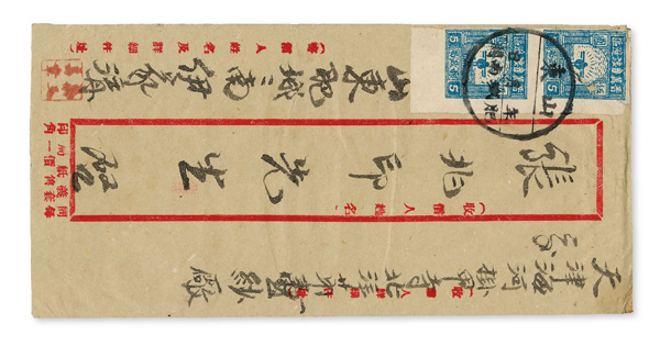 4337 cover imageca. 1946, Cover from Shandong to Tientsin, franked by bright and fresh bottom right corner vertical pair of $5 Bird on Globe, tied by bold but undated strike of Shandong postmark; stamps with diagonal crease, the top stamp with small internal void, but still a cover with great eye appeal, Fine to Very Fine. (Image1) (Image2) (All Images)