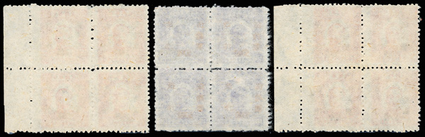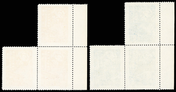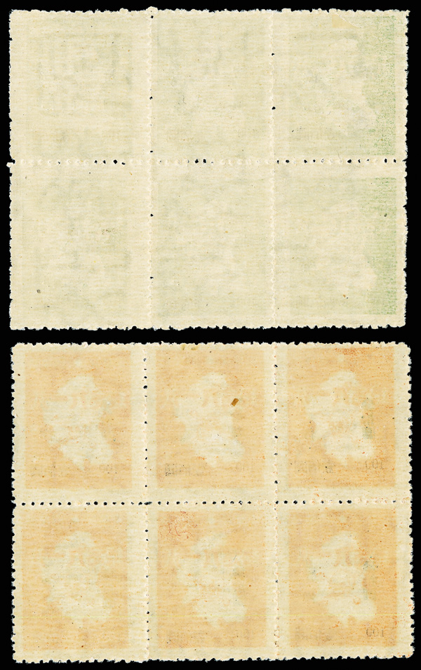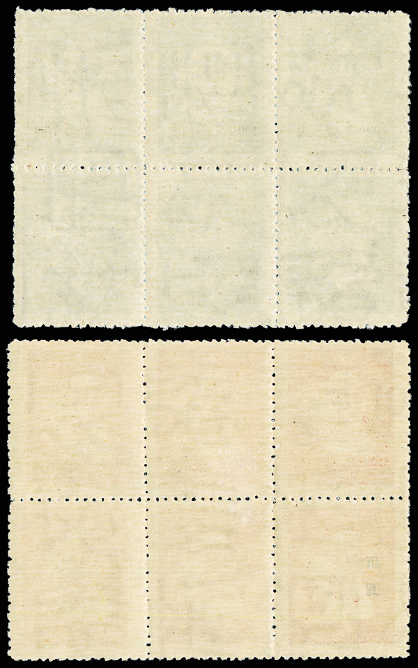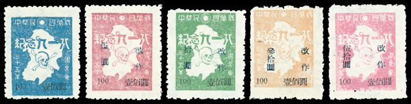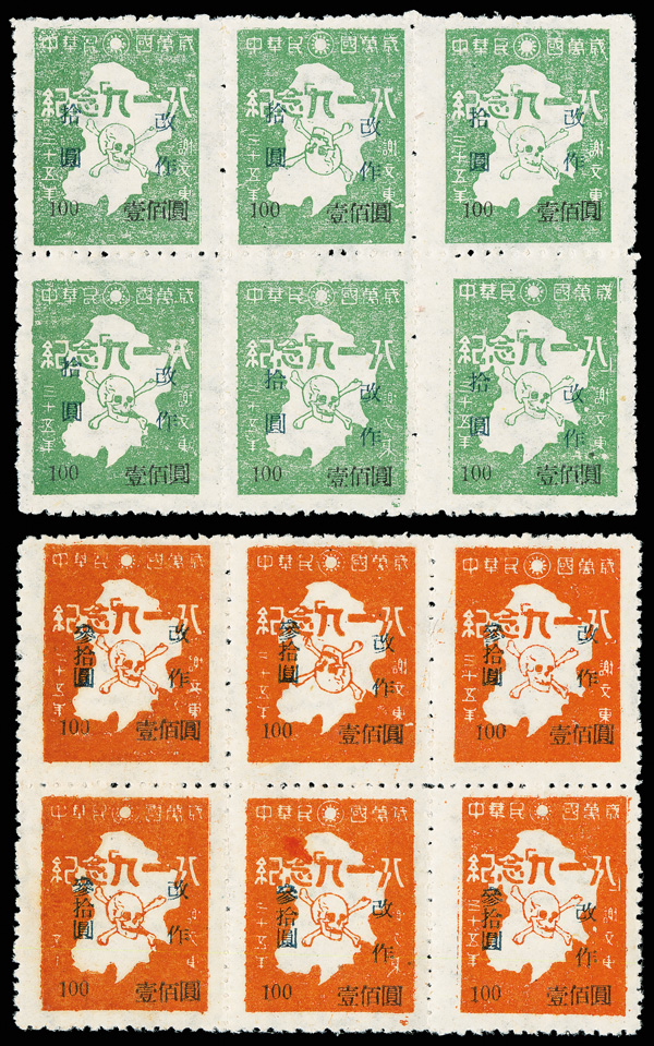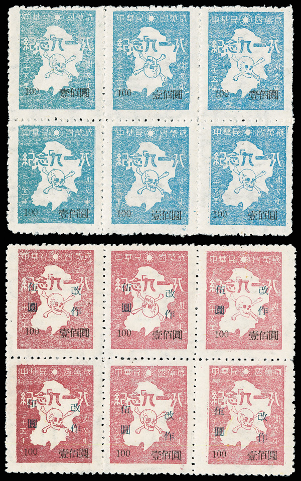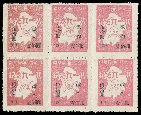 4351 nh image1946, Bo Tsing Local Issue complete, skull & crossbones inverted (Chan AP81-85), position 2 in block of six of each value, the blocks fresh and clean, o.g., never hinged; an occasional small fault not affecting the error, Very Fine. (Image1) (Image2) (Image3) (Image4) (Image5) (Image6) (All Images)