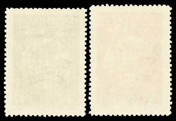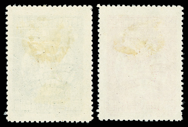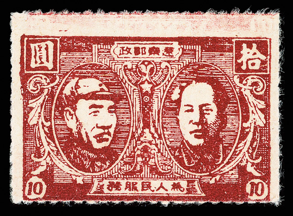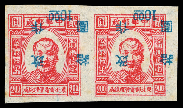4356 ng image1947 (Aug. 29), $10 on $2 rose red second surcharge on Chairman Mao, first print with new value, surcharge inverted (Yang NE78b), horizontal pair, surcharge in blue on imperforate stamps, wonderfully fresh with full to large margins, without gum as issued, Very Fine. (Image1) (Image2) (All Images)