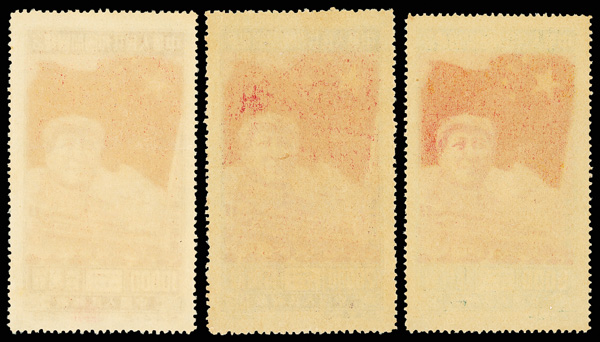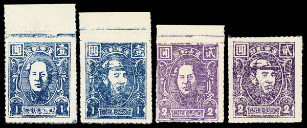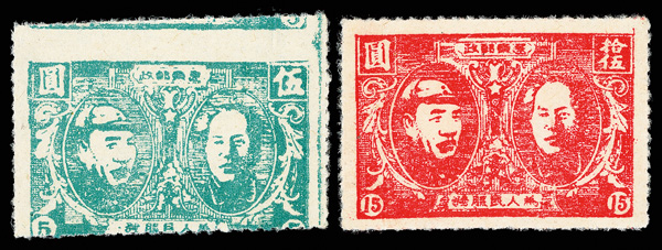 4357 ng image1946, East Liaoning Local Post, Andong 1st printing, Zhu De and Chairman Mao complete (Yang NE239-245), fresh set with several marginal, all with bold color and surprisingly clean impression, without gum as issued; $15 horizontal crease at bottom, still Fine to Very Fine. (Image1) (Image2) (Image3) (Image4) (Image5) (Image6) (All Images)