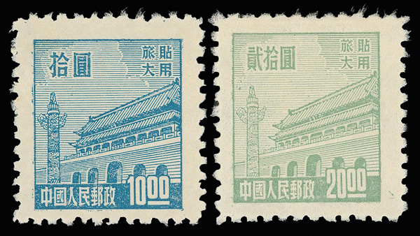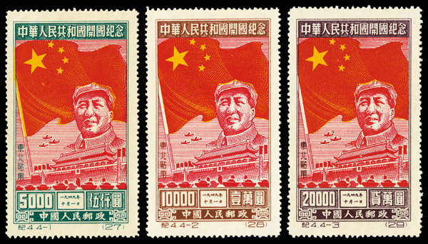 4368 ng image1950, Tien An Men, $10-$100 complete (Yang AD69-73. Scott 2L72-2L76), all fresh and bright, nicely centered; $20 showing plate nail print at top, without gum as issued, Very Fine. Scott $735 (HK$ 5,650). (Image1) (Image2) (Image3) (Image4) (All Images)