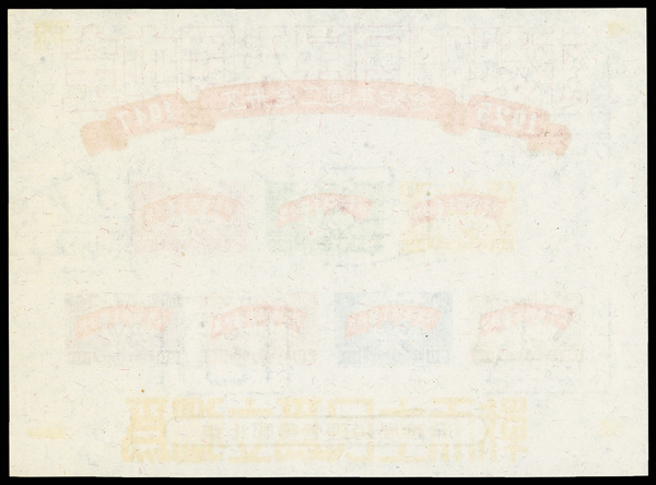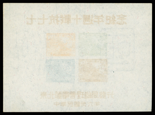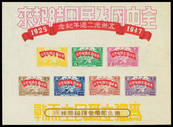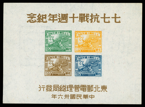 4355 ng image1947, 10th Anniversary of Outbreak of War with Japan souvenir sheet (Yang NE68M. Scott 1L44a), an unusually fresh and sound sheet with bold colors, without gum as issued, Very Fine. Scott $475 (HK$ 3,650). (Image1) (Image2) (All Images)