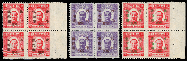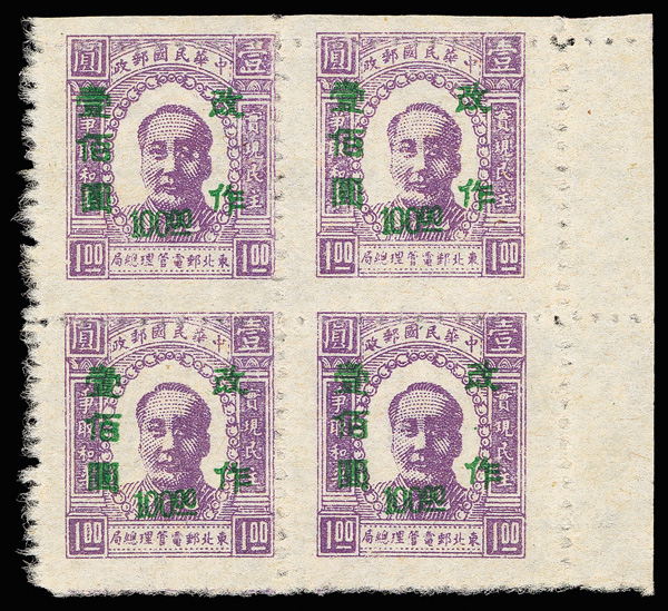 4353 ngbl image1947, surcharges on Chairman Mao, 1st printing complete (Yang NE36-43. Scott 1L20-1L23), blocks of 4, all but #1L20 marginal, fresh and appealing, without gum as issued, Fine to Very Fine. Scott $480 as singles (HK$ 3,690). (Image1) (Image2) (Image3) (Image4) (All Images)