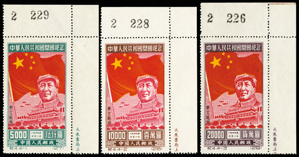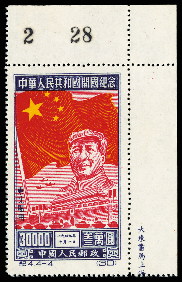 4361 ng image1950, Inauguration of the People's Republic, N.E. Use (C4NE) complete (Yang C27-30. Scott 1L150-1L153), a matched set of top right corner margin singles with sheet number and partial imprints, all sound with bold colors, without gum as issued, Very Fine and select. Scott $1,025 (HK$ 7,880). (Image1) (Image2) (Image3) (Image4) (All Images)