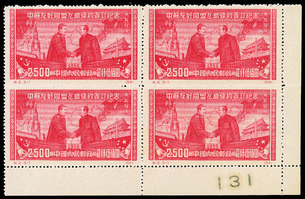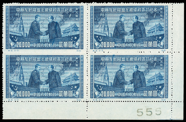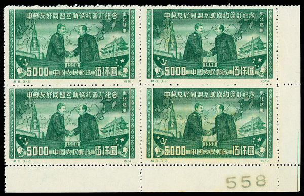 4365 ngbl image1950, Sino-Soviet Treaty, N.E. Use (C8NE) complete (Yang C54-56. Scott 1L176-1L178), bottom right corner margin sheet number blocks of 4, Post Office fresh, all perforations sound, without gum as issued, Very Fine. Scott $328 as singles (HK$ 2,520). (Image1) (Image2) (Image3) (Image4) (Image5) (Image6) (All Images)