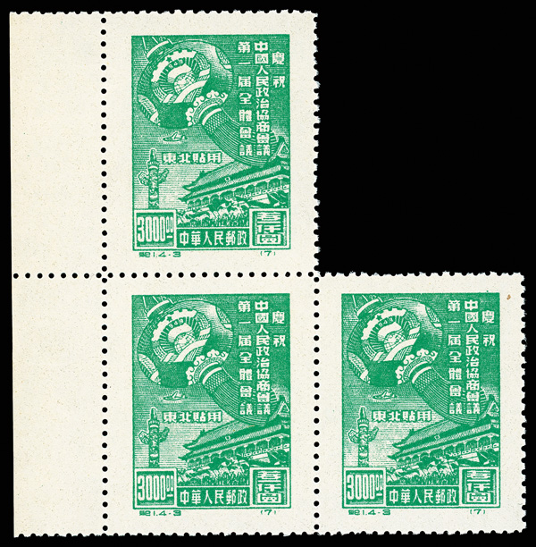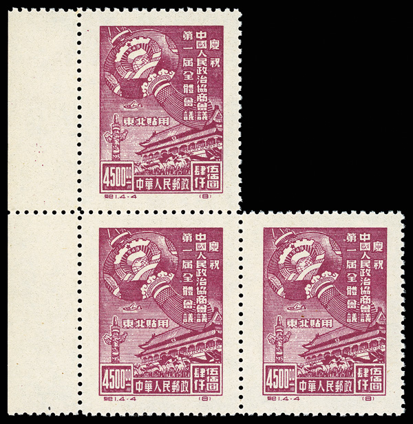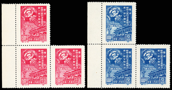 4358 ngbl image1950, 1st Session of People's Political Consultative Conference, N.E. Use (C1NE) complete (Yang C5-8. Scott 1L121-1L124), left margin irregular blocks of 3, a desirable and clean set, without gum as issued, Very Fine. Scott $600 as singles (HK$ 4,620). (Image1) (Image2) (Image3) (Image4) (Image5) (Image6) (All Images)