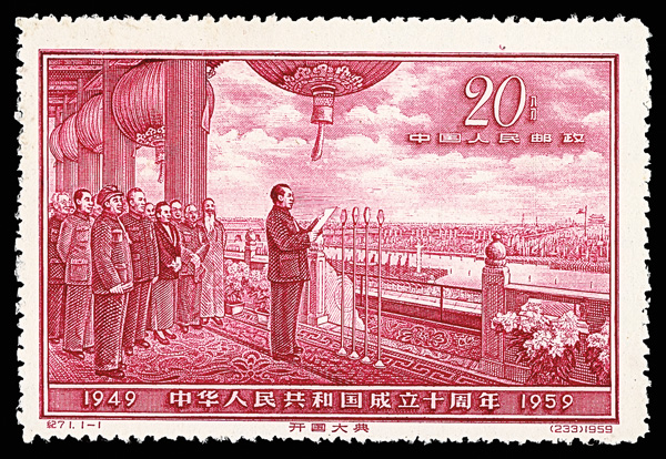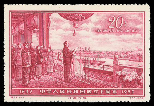 4392 ng image1959, 10th Anniversary of the People's Republic (5th Issue) (C71) (Yang C233. Scott 456), exceptionally well centered single with bold color, without gum as issued, Very Fine. Scott $450 (HK$ 3,460). (Image1) (Image2) (All Images)