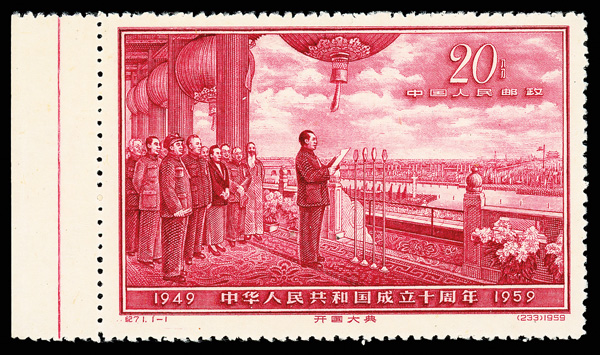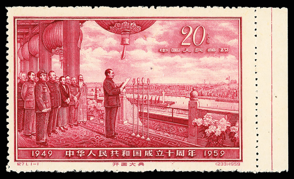4393 ng image1959, 10th Anniversary of the People's Republic (5th Issue) (C71) (Yang C233. Scott 456), left margin single, with rich color, without gum as issued, Very Fine and choice. Scott $460 (HK$ 3,540). (Image1) (Image2) (All Images)