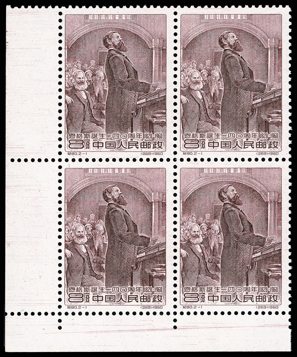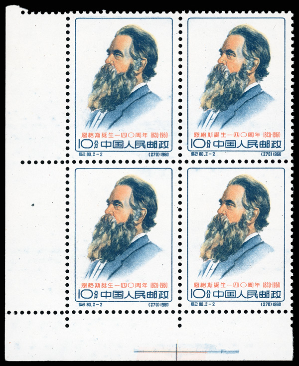 4401 nhbl image1960, Engels (C80) complete (Yang C269-270. Scott 540-541), bottom left corner margin blocks of 4, bright and sound with lovely colors, o.g., never hinged, Very Fine. Scott $420 as singles (HK$ 3,230). (Image1) (Image2) (Image3) (Image4) (All Images)