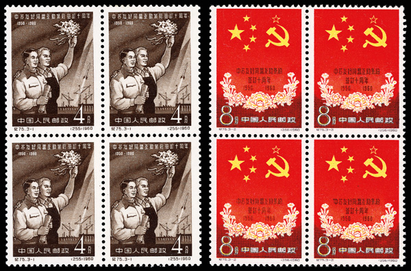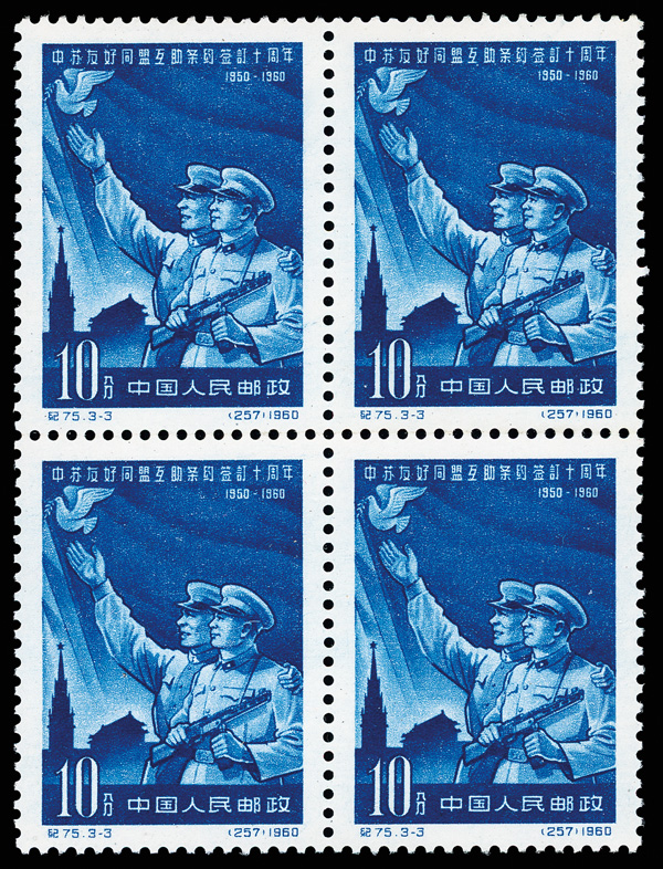 4398 nhbl image1960, Sino-Soviet Treaty (C75) complete (Yang C255-257. Scott 494-496), blocks of 4, fresh and well centered, o.g., never hinged, Very Fine. Scott $430 as singles (HK$ 3,310). (Image1) (Image2) (Image3) (Image4) (All Images)
