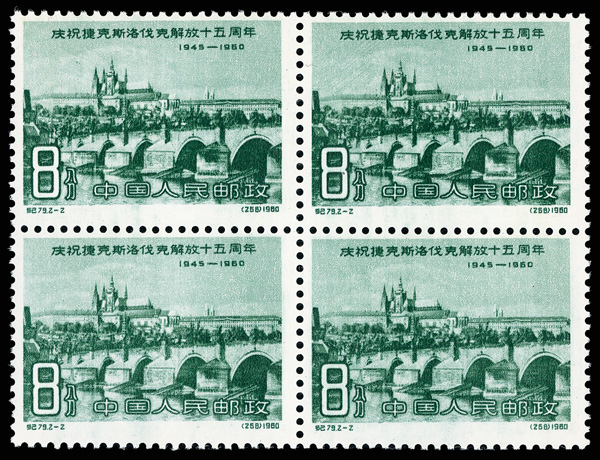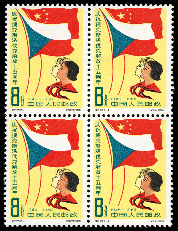 4400 nhbl image1960, Liberation of Czechoslovakia (C79) complete (Yang C267-268. Scott 504-505), blocks of 4, Post Office fresh, o.g., never hinged, Very Fine. Scott $400 as singles (HK$ 3,080). (Image1) (Image2) (Image3) (Image4) (All Images)