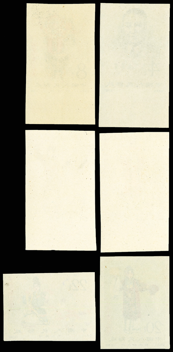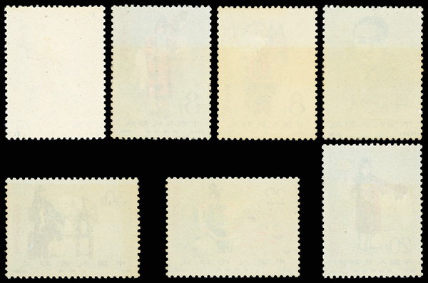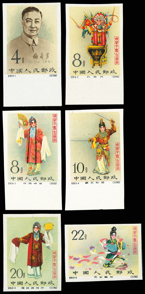 4422 nh image1962, Mei Lan-fang, imperforate (C94i) complete (Yang C307i-314i. Scott 620-627 vars.), with bright, fresh colors and unblemished gum, all the 4f-10f values with bottom margin, o.g., never hinged, Very Fine, seldom offered in this Post Office fresh quality. Scott $6,750 (HK$ 51,920). (Image1) (Image2) (Image3) (Image4) (All Images)