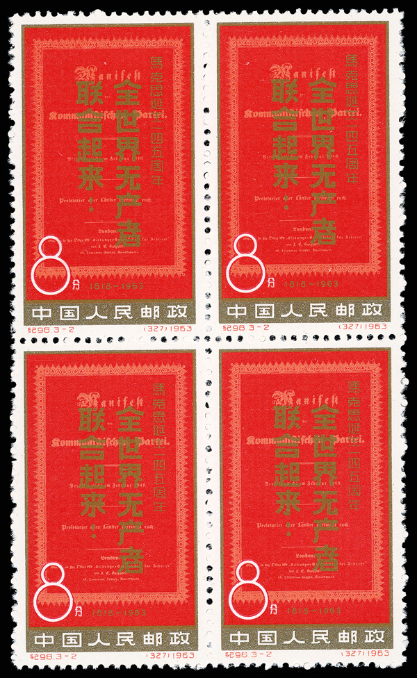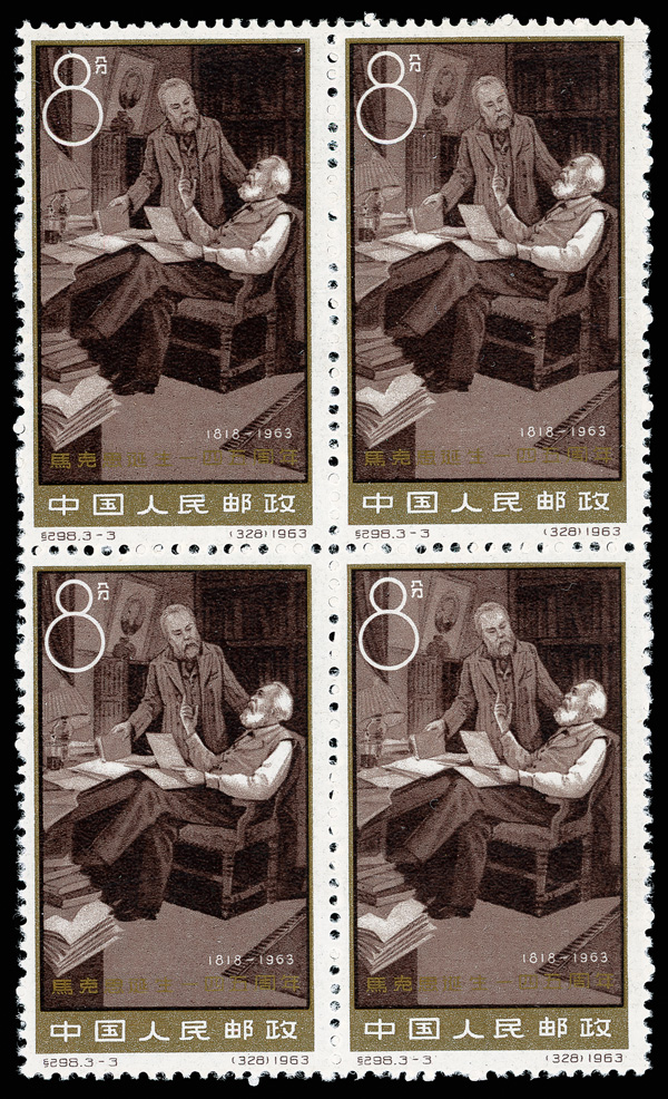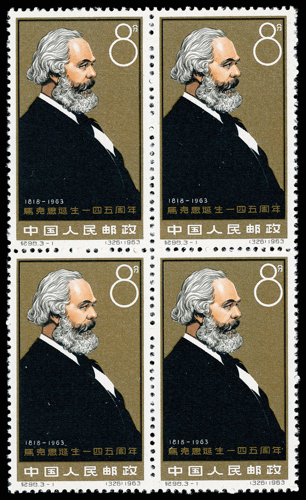 4430 ngbl image1963, Karl Marx (C98) complete (Yang C325-327. Scott 681-683), blocks of 4, each with bright colors and excellent centering, without gum as issued, Very Fine. Scott $340 as singles (HK$ 2,620). (Image1) (Image2) (Image3) (Image4) (Image5) (Image6) (All Images)
