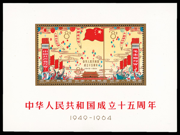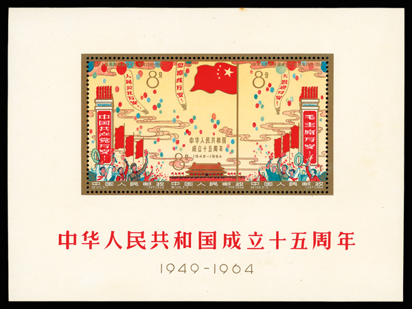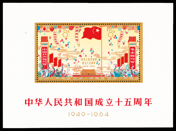 4433 nh image1964, 15th Anniversary of the People's Republic souvenir sheet (C106M) (Yang C106M. Scott 798a), an exceptional example of this scarce sheet with bright fresh colors and clean, white gum showing a few barely noticeable natural gum skips, o.g., never hinged, still Very Fine+. Scott $4,250 (HK$ 32,690). (Image1) (Image2) (All Images)