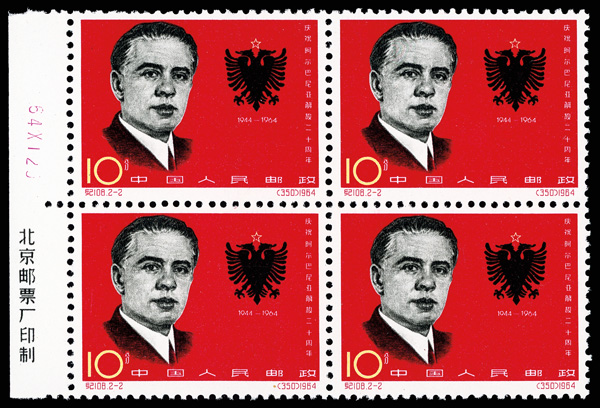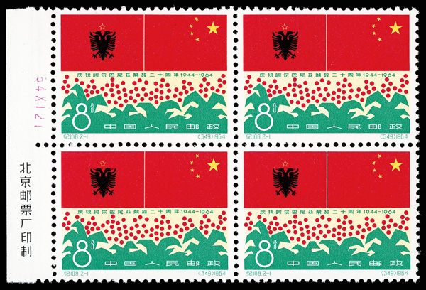 4435 nhbl image1964, Liberation of Albania (C108) complete (Yang C348-349. Scott 804-805), left margin imprint blocks of 4, Post Office fresh with rich colors, o.g., never hinged, Very Fine. Scott $410 as singles (HK$ 3,150). (Image1) (Image2) (Image3) (Image4) (All Images)