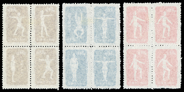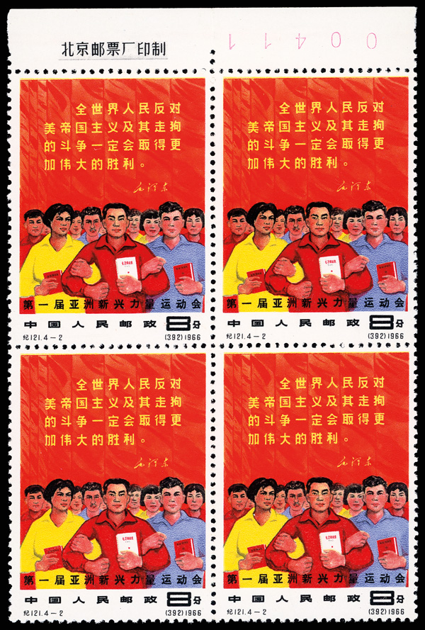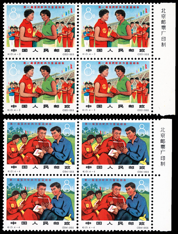 4441 nhbl image1966, Athletic Games of New Emerging Forces (C121) complete (Yang C390-393. Scott 920-923), margin blocks of four with all but #4-1 an imprint block; each pristine with vibrant colors, o.g., never hinged, Very Fine. Scott $1,280 as singles (HK$ 9,850). (Image1) (Image2) (Image3) (Image4) (Image5) (Image6) (All Images)