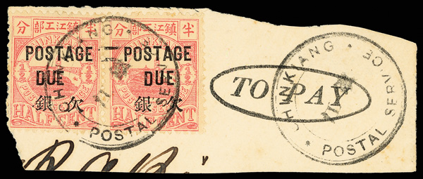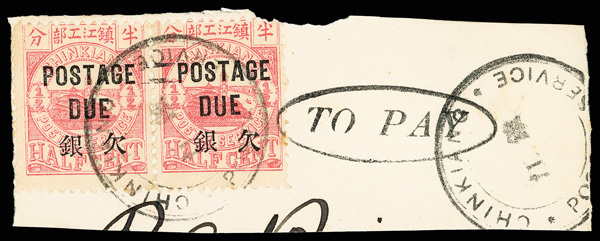 pair, each showing the variety, tied on piece by one of two "Chinkiang/Postal Service" postmarks with oval "TO PAY" handstamp alongside; left stamp shows the additional "'DUE' shifted to left" variety, Very Fine, rare item. (Image1) (Image2)