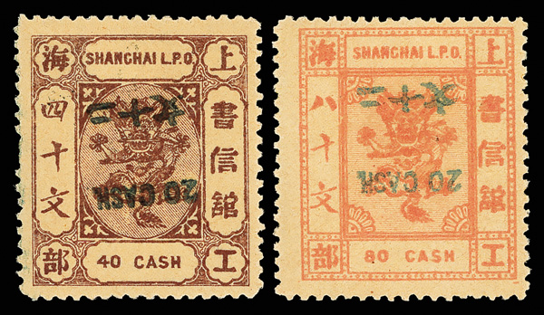 1888, Small Dragon, 20 cash on 40 cash brown, horizontal surcharge inverted & 20 cash on 80 cash flesh, surcharge inverted (Chan