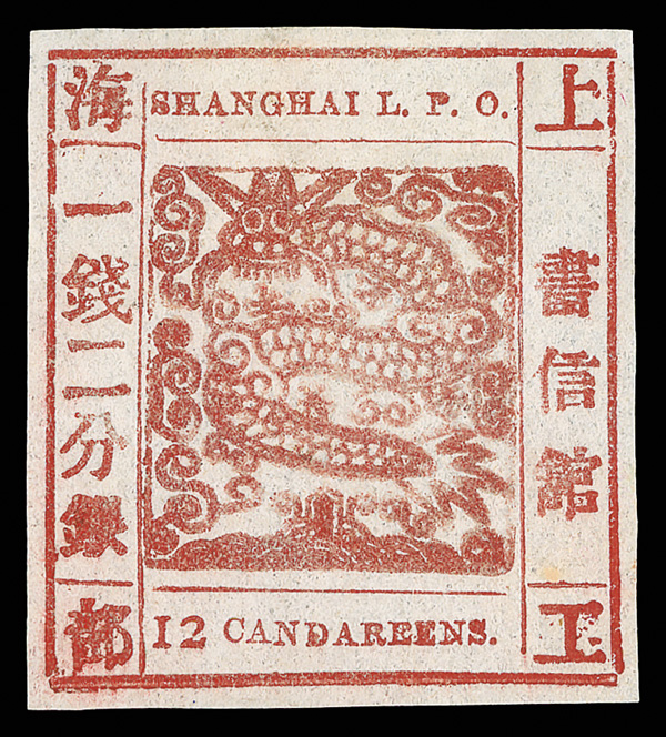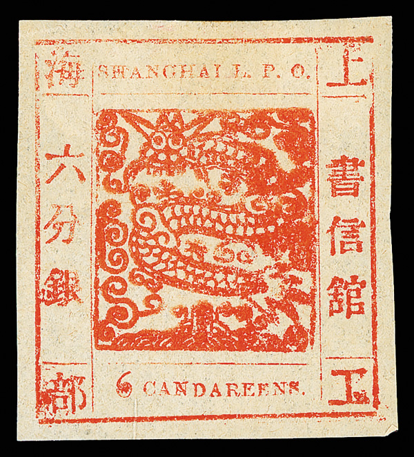 1866, Large Dragon (Antique Numerals, "CANDAREENS" plural), 6ca scarlet, wove paper (Chan LS20. Scott 23. Livingston 25),