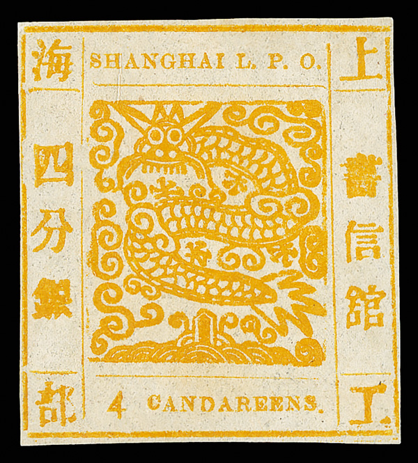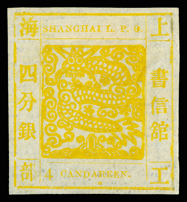 1865, Large Dragon (Antique Numerals, "CANDAREEN" singular), 4ca yellow, laid paper (Chan LS10. Scott 10. Livingston 9),