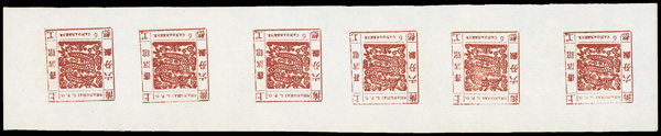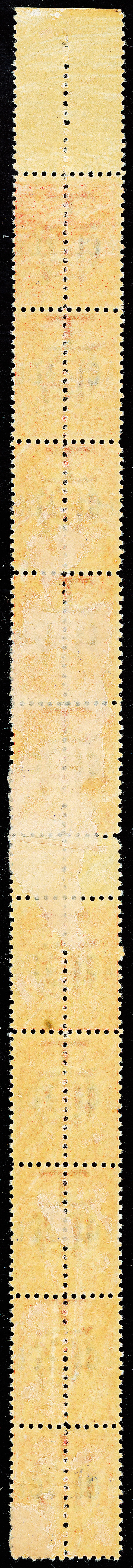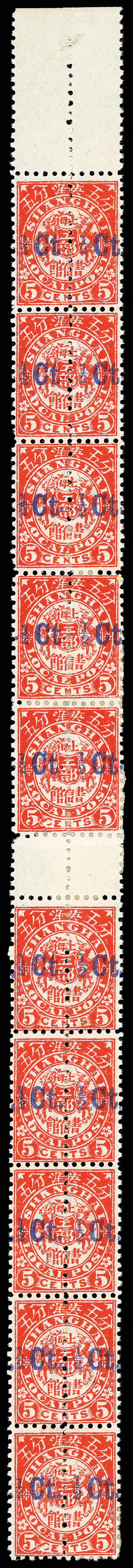 1893, Double Dragons, ½¢ on half of 5¢ carmine pink (Chan LS141. Scott 145), vertical strip of 10 with