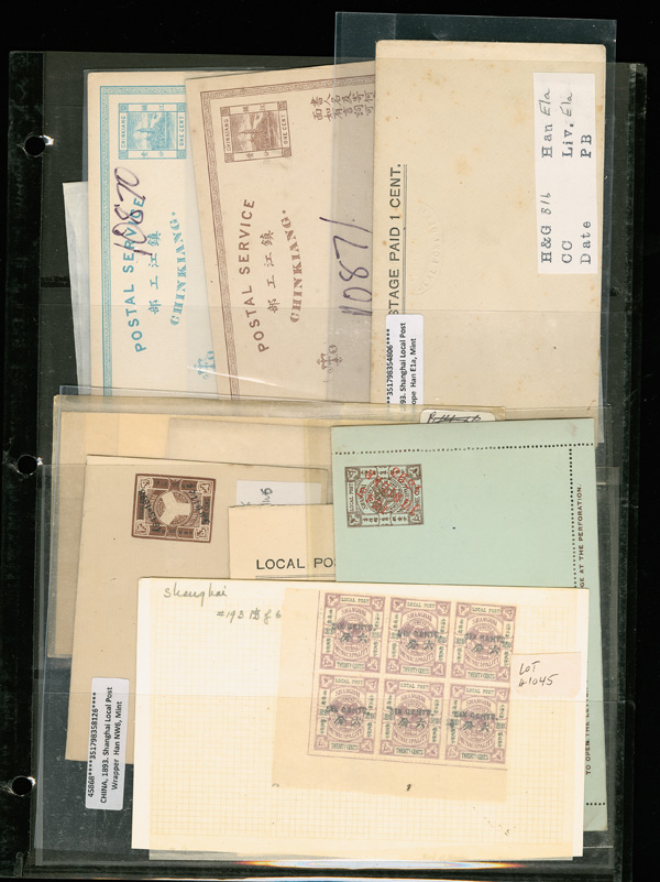 Chinkiang and Kewkiang, Tientsin bogus issues, and solid postal stationery—with particularly strong Shanghai—varieties identified by H&G, Han and/or Livingston numbers; an attractive compilation worth close review, Very Fine overall,