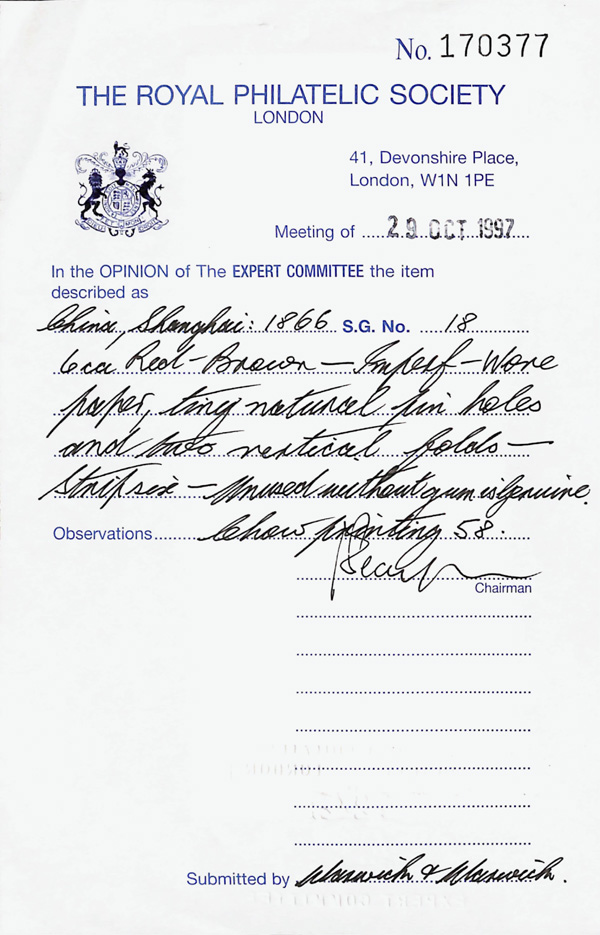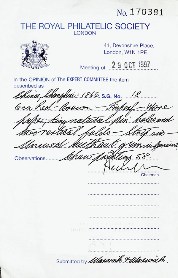 R.P.S.L. certificate. Scott $2,100 as singles (HK$ 16,150). (Image1) (Image2)