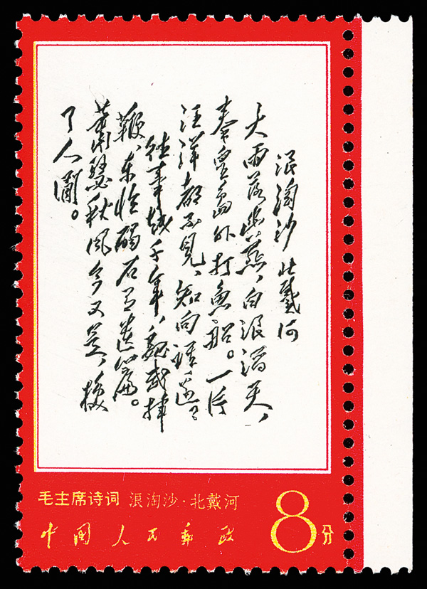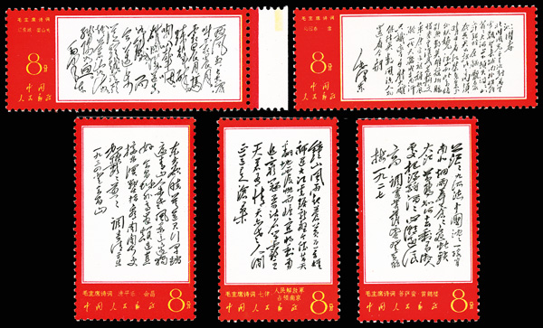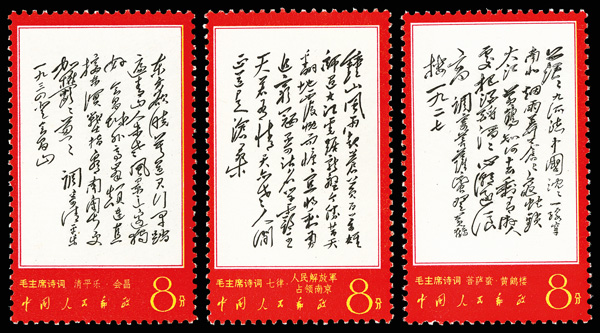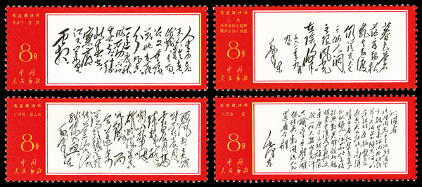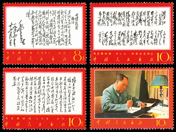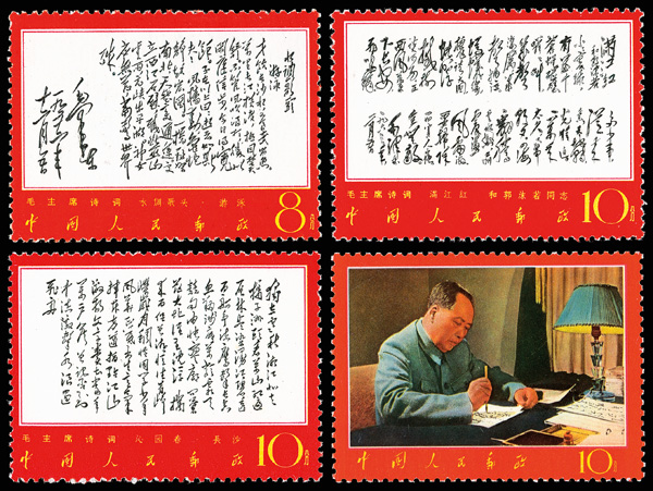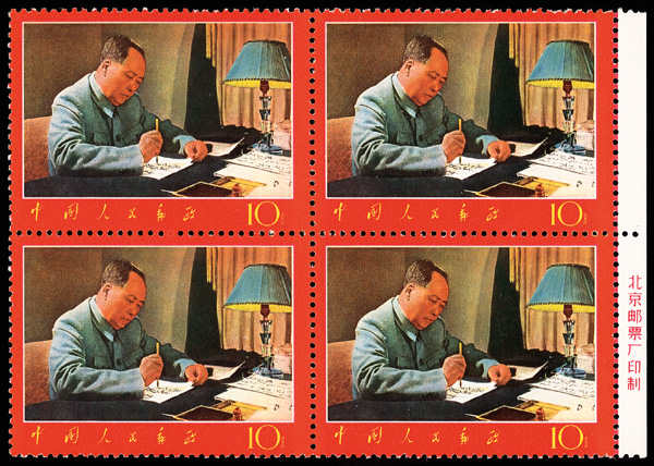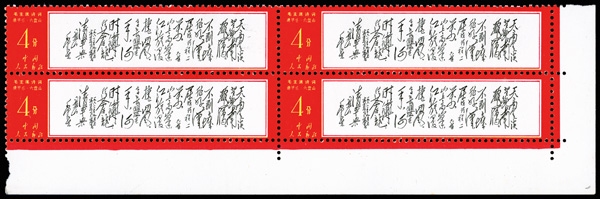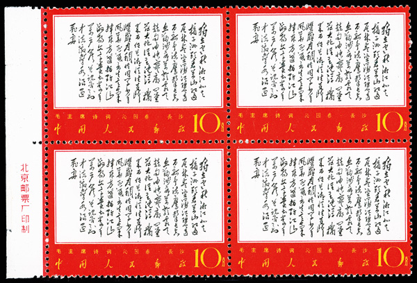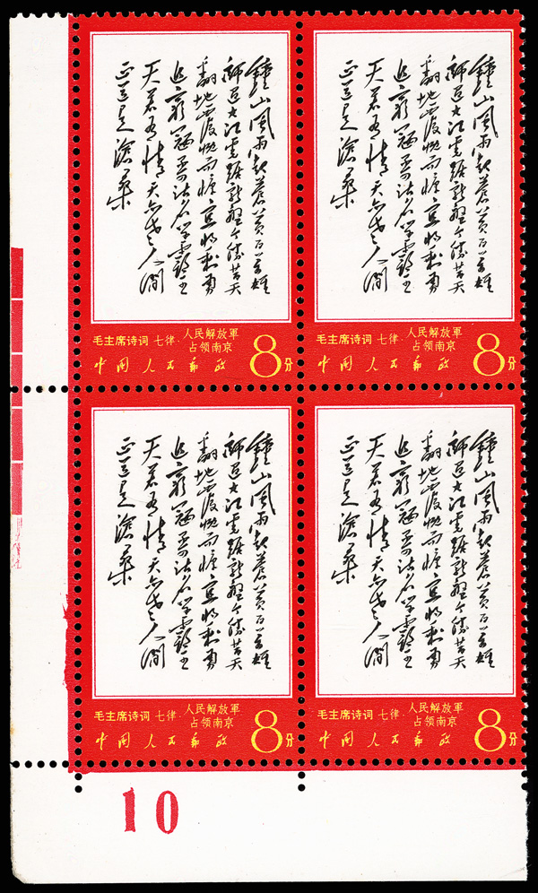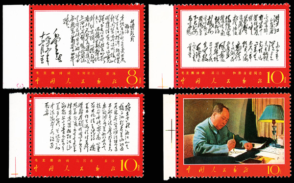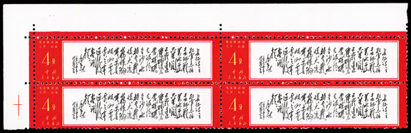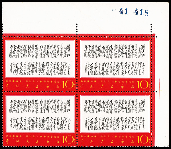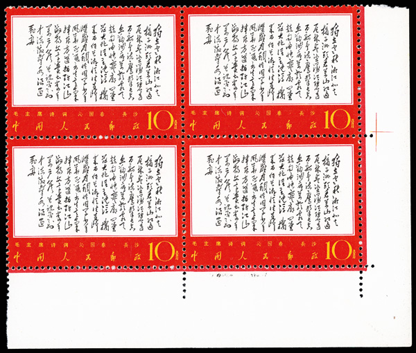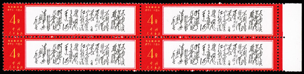 4535 nhbl image1967-68, Poems of Chairman Mao (W7), 10f Mao Writing Poem, "Changsha" and "Reply to Comrade Guo Moro" (Yang W39, W44, W52. Scott 978-980), blocks of four, #978 upper right corner margin with sheet number, #979 lower right corner margin, #980 right margin with imprint, all Post Office fresh with bright colors, o.g., never hinged, Very Fine. Scott $1,430 as singles (HK$ 11,000). (Image1) (Image2) (Image3) (Image4) (Image5) (Image6) (All Images)