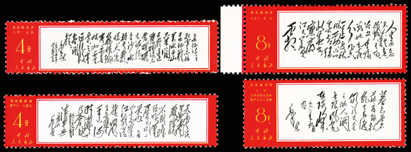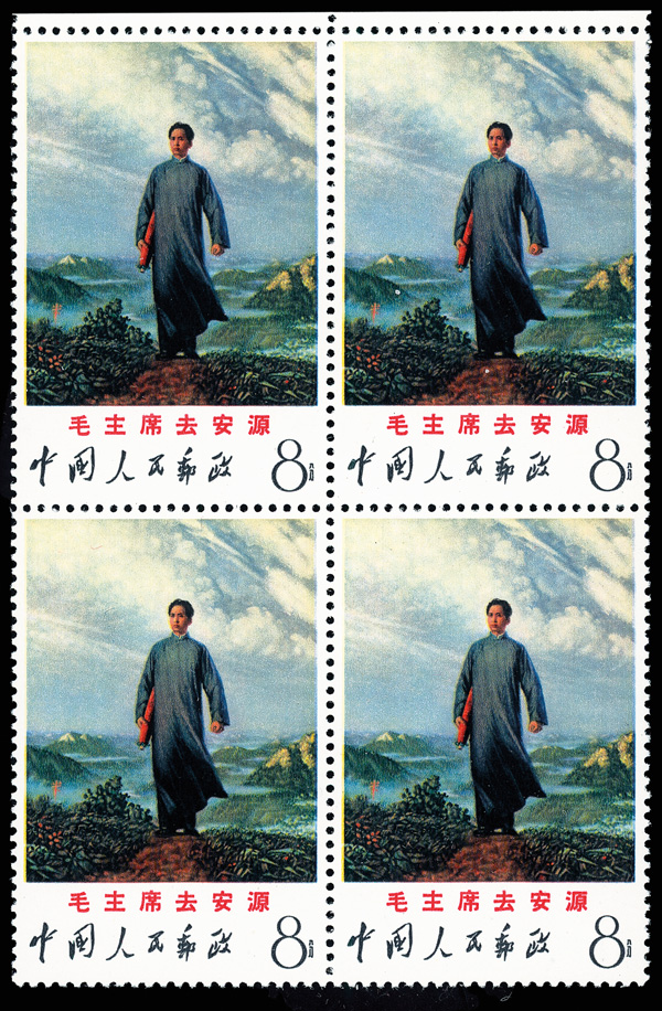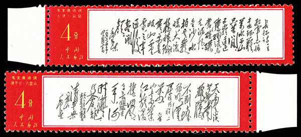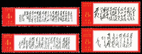 4538 nhbl image1967-68, Poems of Chairman Mao (W7), 8f "The Long March" & 8f "Mount Liupan" (Yang W45-46. Scott 967-968), margin blocks of four, Post Office fresh with bold colors, o.g., never hinged, Very Fine. Scott $1,120 as singles (HK$ 8,620). (Image1) (Image2) (Image3) (Image4) (All Images)