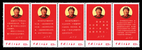 4545 nh image1968, Directives of Chairman Mao (W10) complete (Yang W55-59. Scott 996a), se-tenant strip of 5, pristine and sound, lightly folded, o.g., never hinged, Very Fine. Scott $7,000 for unfolded strip (HK$ 53,850). (Image1) (Image2) (All Images)