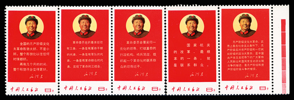 4543 nh image1968, Directives of Chairman Mao (W10) complete (Yang W55-59. Scott 992-996), a right margin "strip of five" attached by a single perforation—thus essentially a pair and strip of three; fresh, o.g., never hinged, Very Fine. Scott $2,375 (HK$ 18,270). (Image1) (Image2) (All Images)