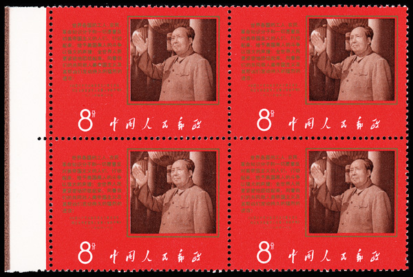 4541 nhbl image1968, Chairman Mao's Anti-American Declaration (W9) (Yang W54. Scott 991), left margin block of 4, sound in superb condition, o.g., never hinged, Very Fine. Scott $1,600 as singles (HK$ 12,310). (Image1) (Image2) (All Images)