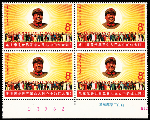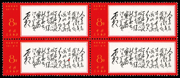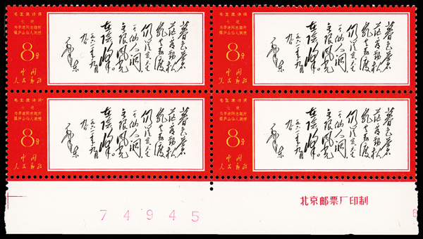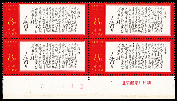 4536 nhbl image1967, Poems of Chairman Mao (W7), 8f "Double Ninth", 8f "Fairy Cave" & 8f "Snow" (Yang W40-41, 48. Scott 969-970, 972), blocks of 4, Post Office fresh, #970 and 972 being bottom margin imprint blocks, o.g., never hinged, Very Fine. Scott $1,380 as singles (HK$ 10,620). (Image1) (Image2) (Image3) (Image4) (Image5) (Image6) (All Images)