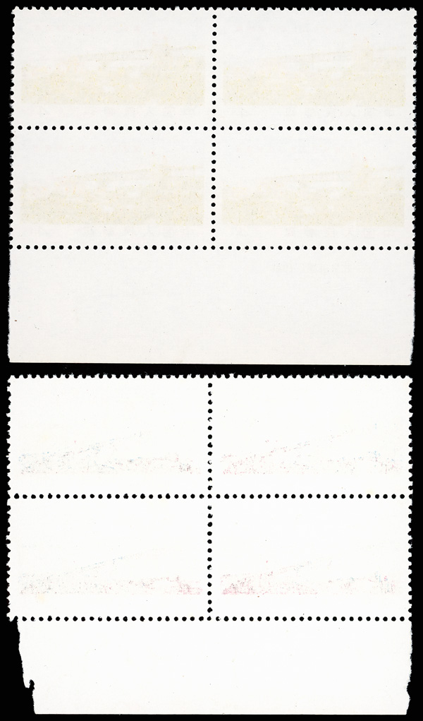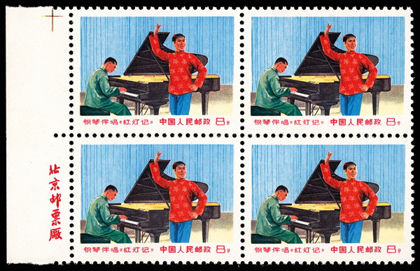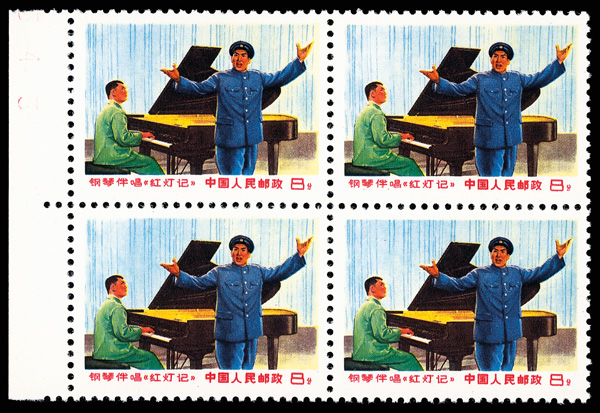 4549 ngbl image1969, "The Red Lantern" (W17) complete (Yang W69-70. Scott 1005-1006), left margin blocks of 4, with bright colors, #1006 with imprint, without gum as issued, Very Fine. Scott $600 as singles (HK$ 4,620). (Image1) (Image2) (Image3) (Image4) (All Images)