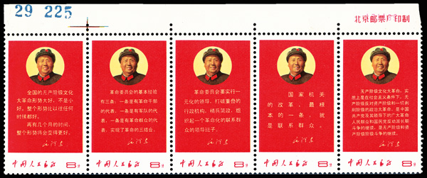 4544 nh image1968, Directives of Chairman Mao (W10) complete (Yang W55-59. Scott 996a), choice top margin strip of five with imprint, unfolded, with brilliant colors in premium Post Office fresh condition, o.g., never hinged, Very Fine. Scott $7,000 (HK$ 53,850). (Image1) (Image2) (All Images)
