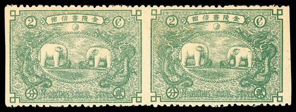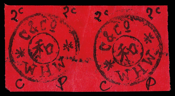 4061 ng image1898, First Issue, 2¢ black on red (Chan LWH1. Scott 1), horizontal pair, with clean, clear design on boldly hued paper, without gum as issued; trivial diagonal paper bend, otherwise Very Fine. Scott $1,400 (HK$ 10,770). (Image1) (Image2) (All Images)