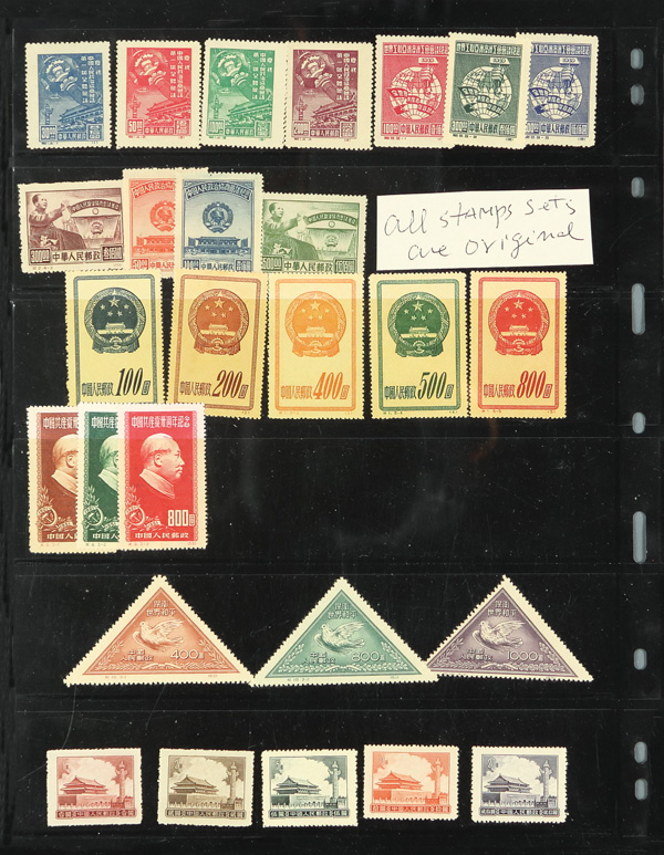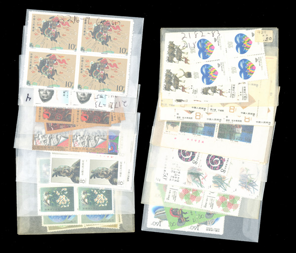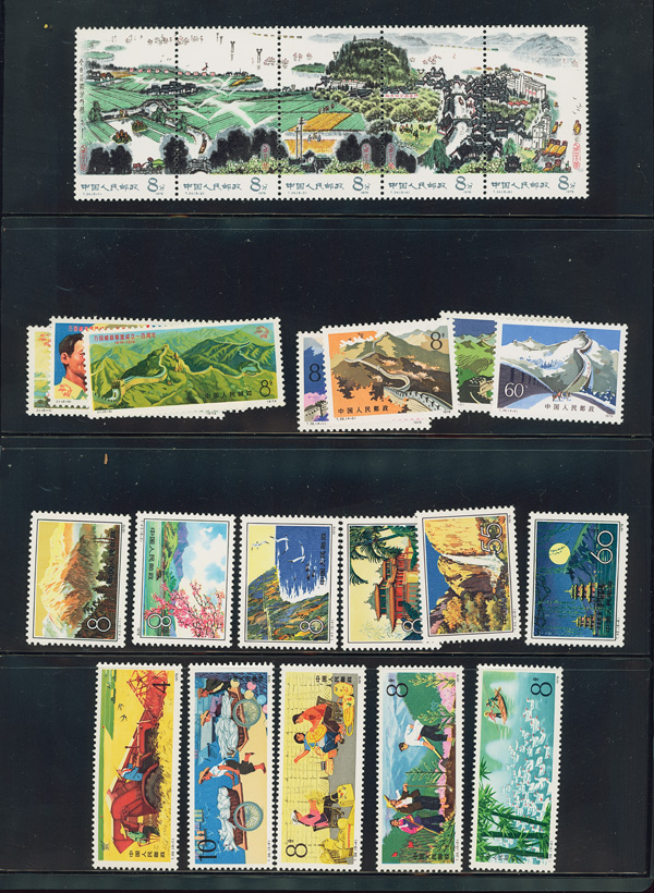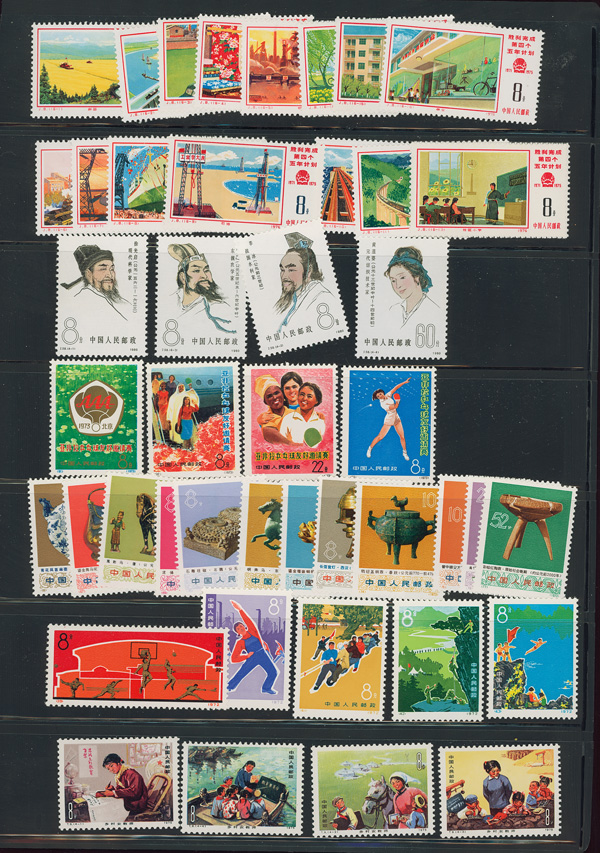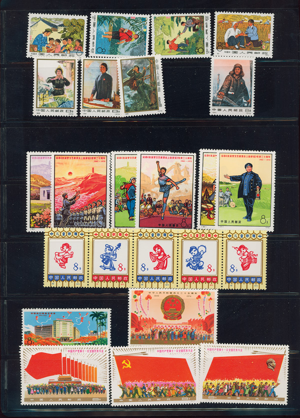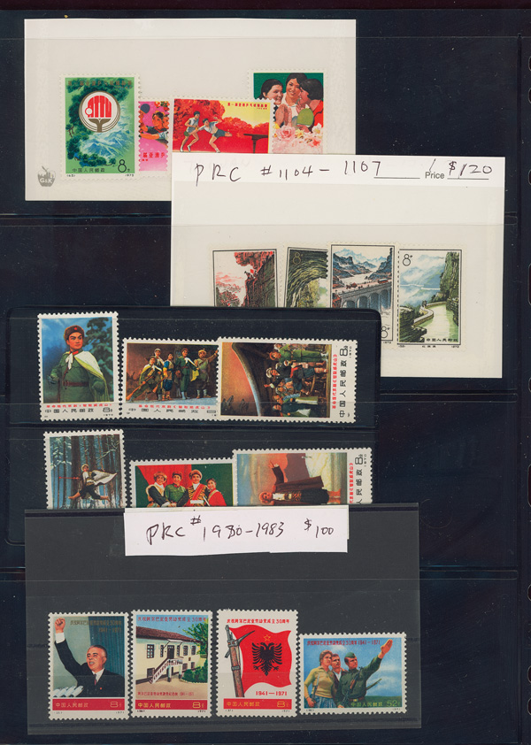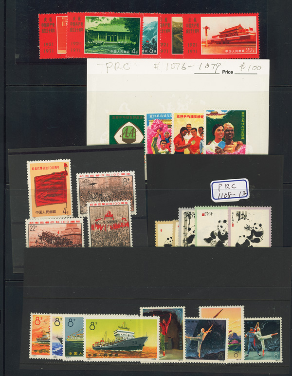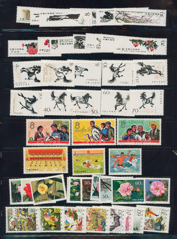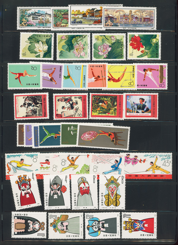 primarily mint sets, with some desirable Cultural Revolution items; includes #1001-1004, 1011-1015, 1047-1054, 1082, 1082-1083, 1095-1098, 1099-1102, 1104-1107, 1108-1113, 1126-1129, 1130, 1131-1142, 1143-1148, 1181-1186, 1194-1198, 1205-1207a,