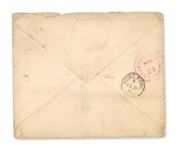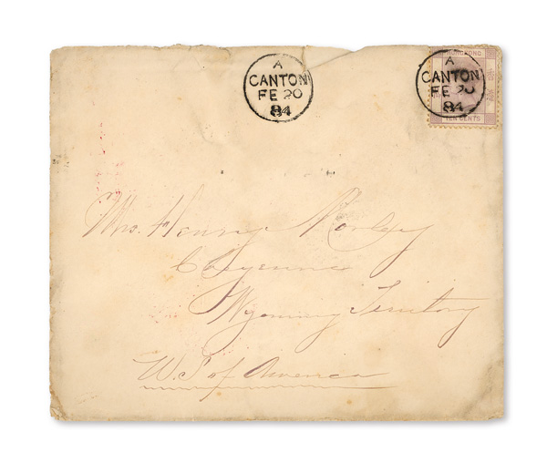 4765 cover image1884 (Feb. 20), Cover from Canton to Cheyenne, Wyoming Territory, franked by Hong Kong 10¢ violet Queen Victoria (#14), tied by one of two "A/Canton/FE 20/84" postmarks (#LCA8); reverse with next-day "Hong Kong/A" and red San Francisco "Mar. 24/Pd. All" transits; light wrinkling to stamp due to placement at top, envelope with slightly rough opening, but a scarce use to pre-statehood Wyoming—a most uncommon destination, Fine to Very Fine. (Image1) (Image2) (All Images)