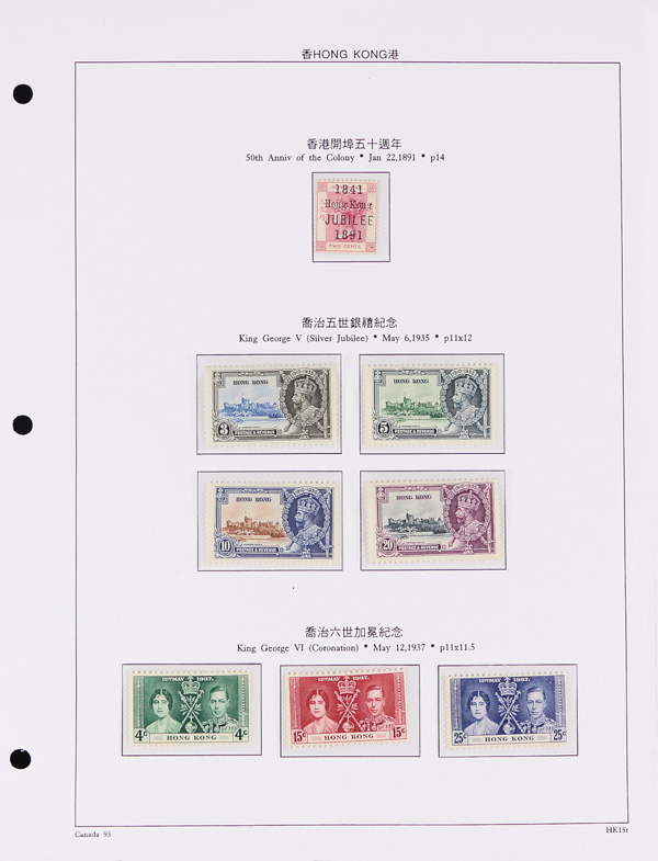 4770 imageHong Kong, Fresh All-Mint Collection, 1891-1969, mounted on album pages or stockpages, our spot checks turning up only never hinged except for 1891 Jubilee (no gum) and 1922-27 King George V Offices in China issue (mixed hinged and never hinged); popular issues including Silver Jubilee (2, 1 never hinged, 1 lightly hinged), 1937 Coronation (3 sets), Silver Wedding, UPU, Queen Elizabeth II Coronation, plus a selection of King George V definitives including #166 and 166A, #185-198 (First Queen Elizabeth II definitives, 3 sets), 203-217 (Annigoni set, 2 sets), and more; fresh and sound with attractive centering throughout; any yellowing in images due to stockpage—the stamps pristine, Very Fine, fully imaged online. (PDF for this Lot) (Image1) (All Images)