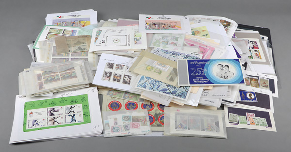 4811 imageThailand, "Thai Break" Mostly Modern Mint Holding, 1891-1990s, One big pile of glassines & "102" cards, virtually all-mint with much of it in blocks and souvenir sheets, and predominantly from the modern era, but some older material too, like mint #233-37, 261a, etc., and some even former auction lots from Michael Rogers and Stanley Gibbons. Many scarcer items from the modern era as well, such as 748a, 832 (imperf & black omitted), 1036a (imperf), 1120f, 1264a, 1319a, 1668 (pane of 10 & deluxe sheet), and many more. Undoubtedly a very significant acquisition cost, generally Fine to Very Fine, additional images online. Shipping charges apply - weight 8 lbs. (PDF for this Lot) (Image1) (All Images)