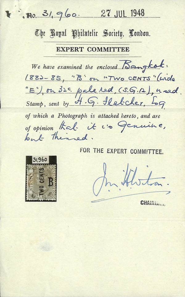 4797 O image1883, "B" on Straits Settlements, 2¢ on 32¢ pale red, Crown CC watermark, wide "S" in "CENTS" (Scott 21. SG 12), bright, fresh stamp with attractive color and lightly struck, face-free cancel; thin, Fine to Very Fine, with 1948 R.P.S.L. certificate. (Image1) (Image2) (Image3) (All Images)