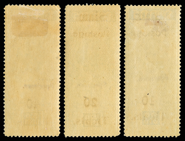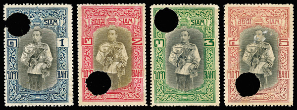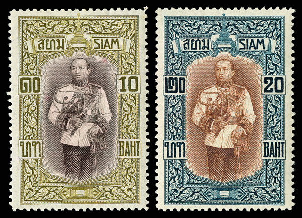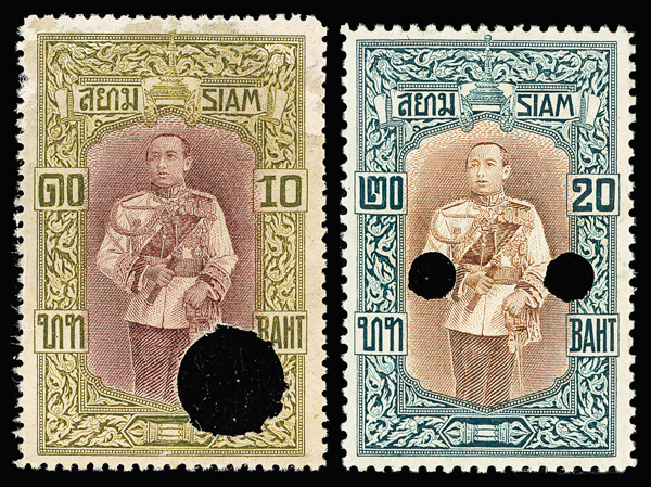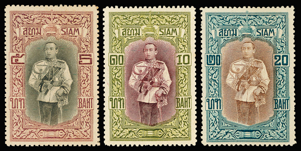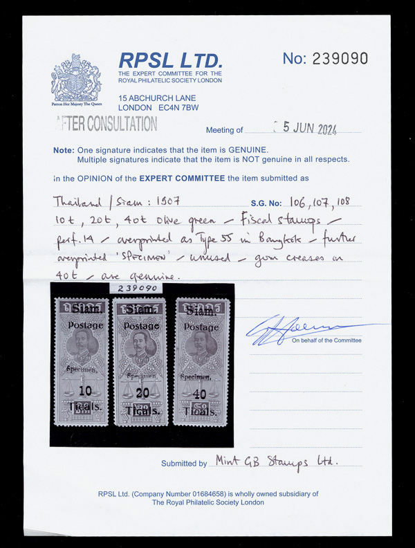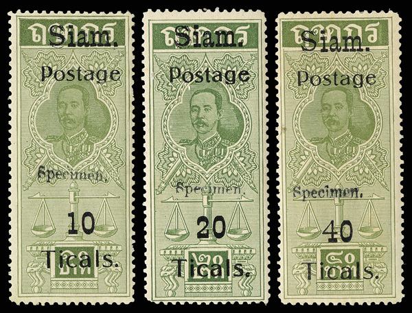 4800 S image1907, King Chulalongkorn, 10t-40t complete, "Specimen" overprint (Scott 106-108), exceptionally fresh with full, clean gum, o.g., mostly lightly hinged, Very Fine, a lovely and rare set, with 2024 R.P.S.L. certificate noting "gum creases on 40t"—which are largely irrelevant. (Image1) (Image2) (Image3) (All Images)