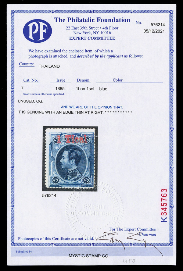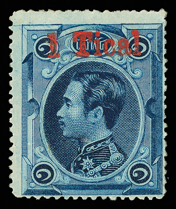 4798 og image1885, King Chulalongkorn, 1t on 1sol blue, surcharge type b (Scott 7), fresh with bold color, o.g., lightly hinged; small edge thin at right, Fine, with 2021 P.F. certificate. (Image1) (Image2) (Image3) (All Images)