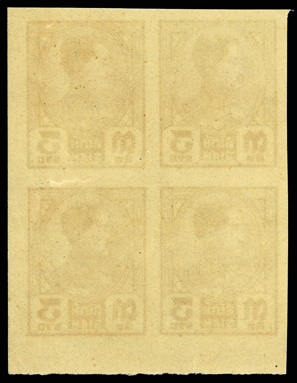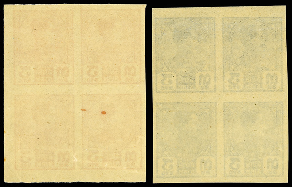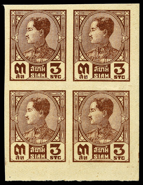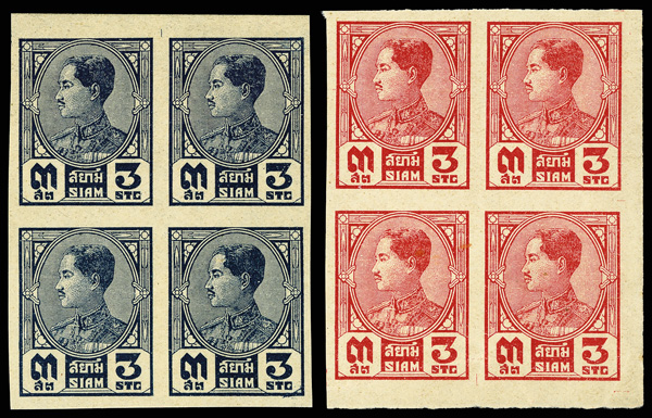 4803 Pbl imageca. 1928, 3stg King Prajadhipok, Proof Blocks (Scott 208 var.), pristine marginal blocks of four in brown, blue, and red, o.g., never hinged, Very Fine, a scarce assembly. (Image1) (Image2) (Image3) (Image4) (All Images)