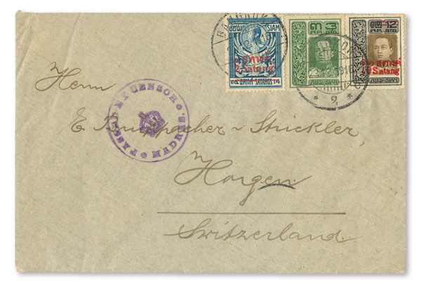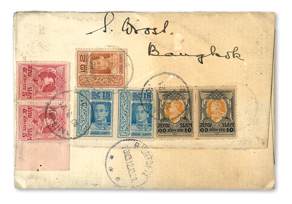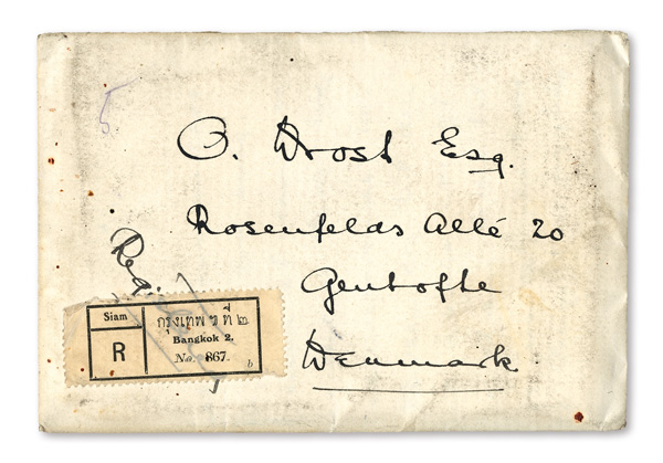 4810 cover image1921 (Mar. 10), Bangkok to Denmark Registered Cover with Contents, a very nice example with attractive multi-color frankings (#187, 190, 193, 194) and light cancels; some general staining and wear as expected, Fine to Very Fine. (Image1) (Image2) (All Images)