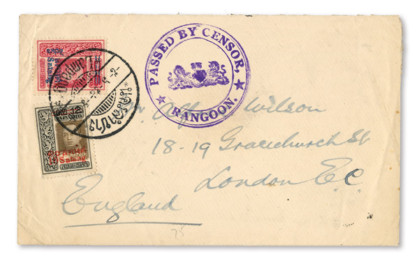 4809 cover image1916, Pair of Censored First World War Covers, both displaying vivid and beautiful censor handstamps and nice frankings; one cover sent to Horgen, Switzerland (with Madras censor mark), the other to London, England (with a particularly attractive Rangoon censor mark), Fine to Very Fine, very attractive, clean covers. (Image1) (Image2) (Image3) (Image4) (All Images)