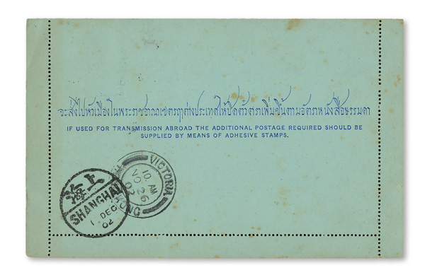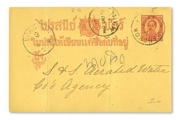 4806 og/O image1901, Pair of Rejected Die 1½a Postal Cards, a desirable and scarce pair of postal cards that were issued by mistake, one postally used and one unused; used card dated 1901 and displaying cancels from Bangkok, not Korat, an unusual usage for this accidental release; notable folds on posted card, seldom seen and very attractive, listed in Thailand Philatelic Handbook - Volume 6 as PC-0006. (Image1) (Image2) (Image3) (Image4) (All Images)