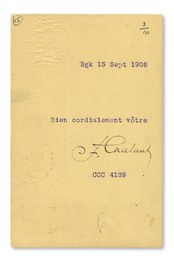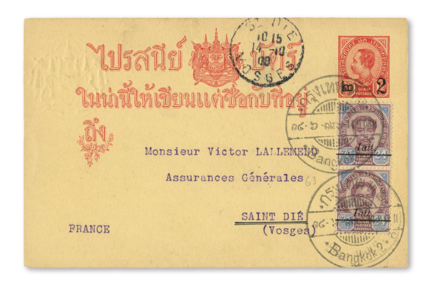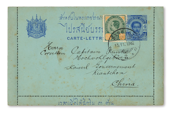 4807 O image1902-08, Pair of Postal Cards: Bangkok to Kiautschou, China & Bangkok to Saint-Dié France, both featuring attractive franking and unique destinations; letter card sent to Kiautschou addressed to a "Corvette Captain Funke" at the "Kaiserl Government", the postal card to France uprated and with two clean strikes of bilingual cancel; China letter card with toning, otherwise Fine. (Image1) (Image2) (Image3) (Image4) (All Images)