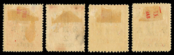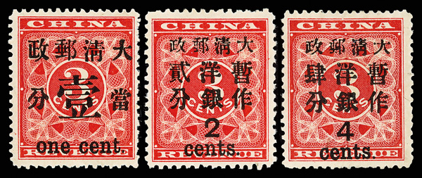 comprising mint o.g. 1¢, Small 2¢ and Large 4¢ surcharges plus Large 2¢ surcharge used with light pakua cancel; mint examples fresh with full o.g. (partial hinge remnants), the 4¢ with a shallow thin, Fine to Very Fine or